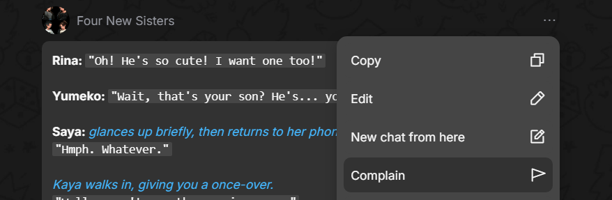 If you believe a character’s message is inappropriate, offensive, or violates community guidelines, report it. Click the three dots in the top-right corner of the message and select Complain. In the window that appears, choose a reason from the list and describe the issue.