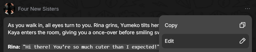 To steer the story in the desired direction, use the message editing feature and write the response you want the character to say. To do this, click the three dots in the top-right corner of the message and select Edit.